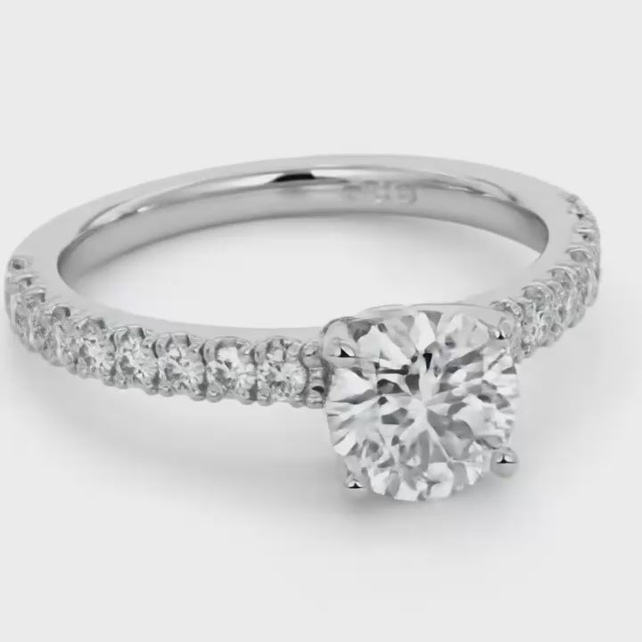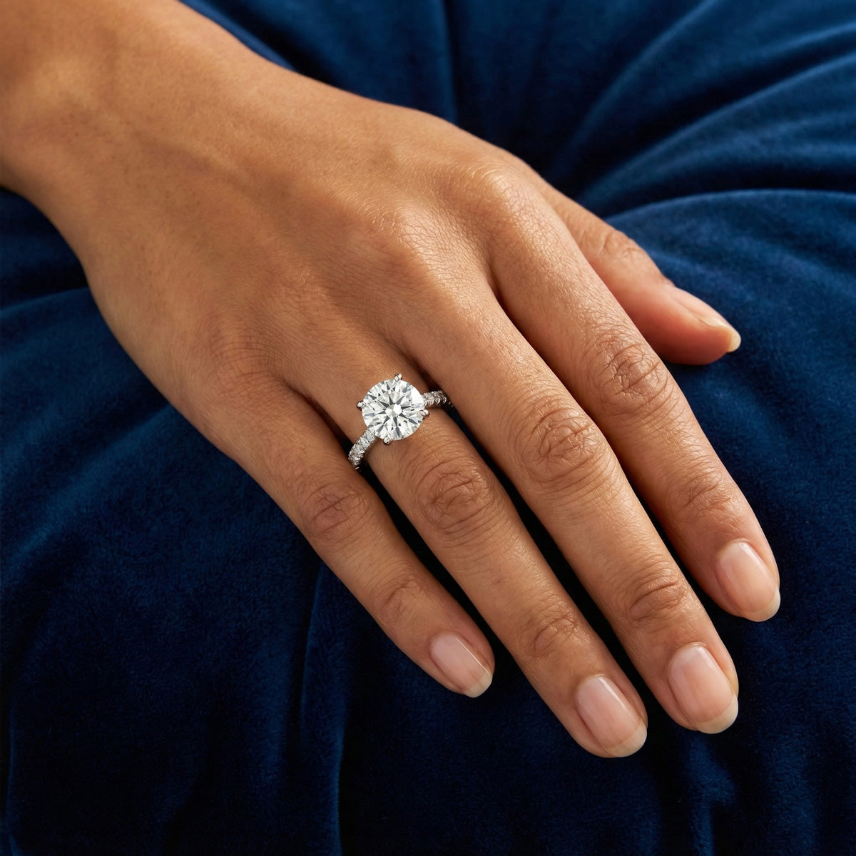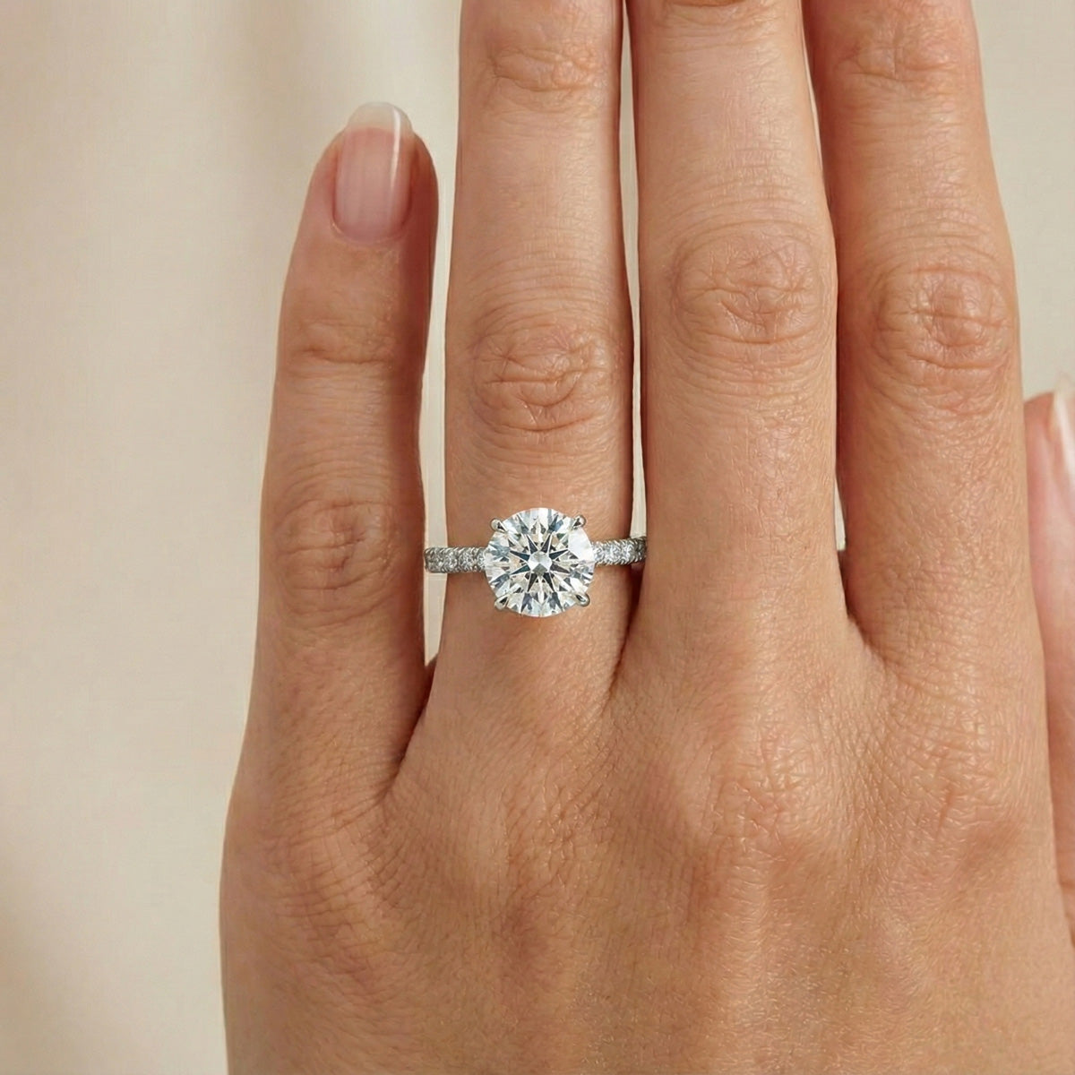 Luminous and elegant, this pavé solitaire ring blends timeless design with refined sparkle. A brilliant round center diamond is secured by four classic prongs, elevated to capture light from every angle. The band, adorned with a row of hand-set pavé diamonds, adds subtle radiance without overpowering the centerpiece. Sleek, balanced, and effortlessly sophisticated, it’s a modern expression of enduring love.
