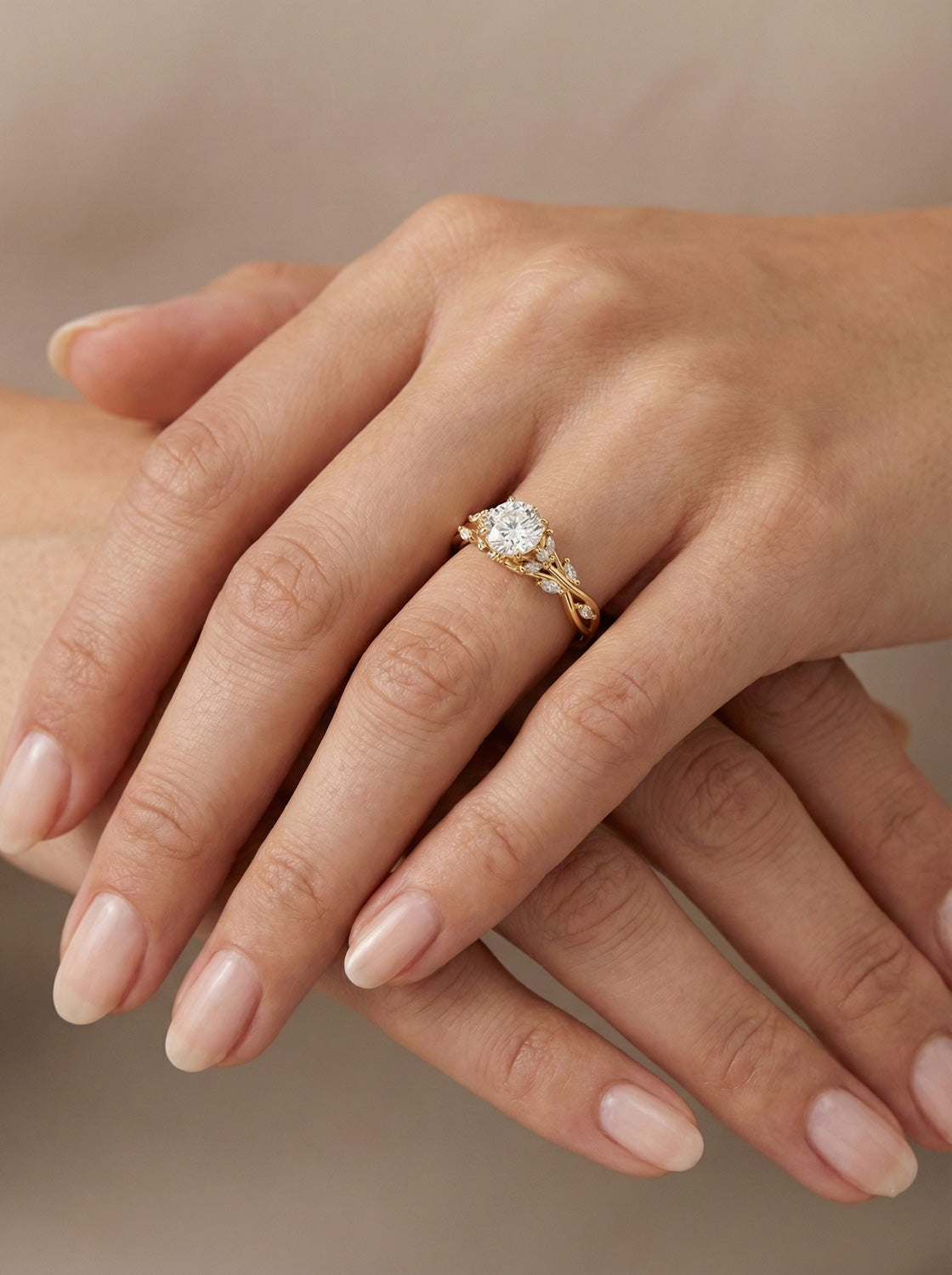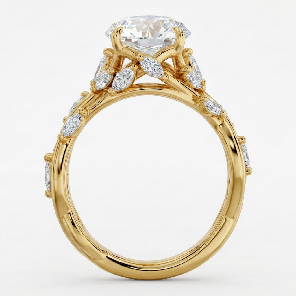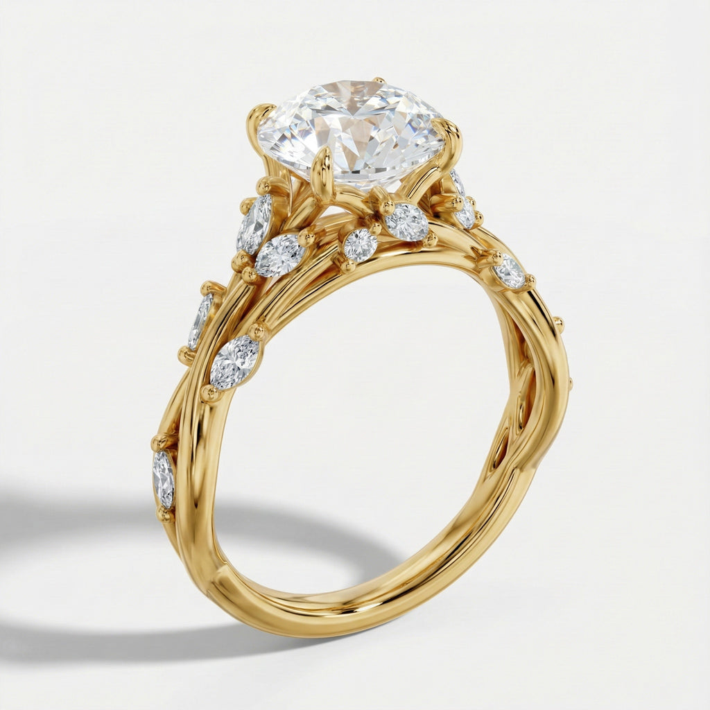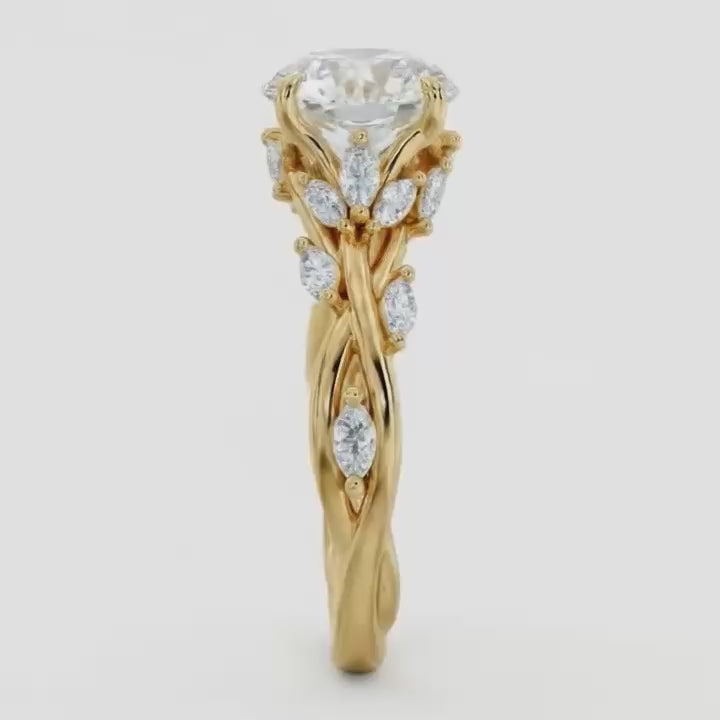 Graceful and distinctive, this flora twist band traces organic curves that echo living vines. Interlacing gold strands cradle leaf-shaped accents along the shank, creating quiet movement and natural texture. Designed to stand alone or frame a solitaire, the band delivers a refined nature motif with clean craftsmanship.
