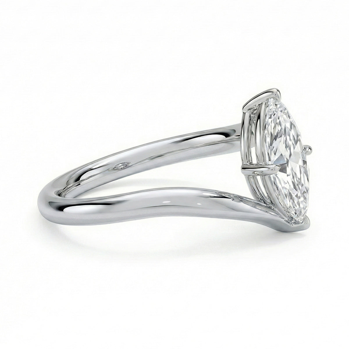 This sculptural band showcases a graceful, fluid twist that draws the eye toward the center stone. Designed for harmony and movement, its seamless curves create a contemporary yet enduring aesthetic - perfect for those who value subtle artistry and refined sophistication.