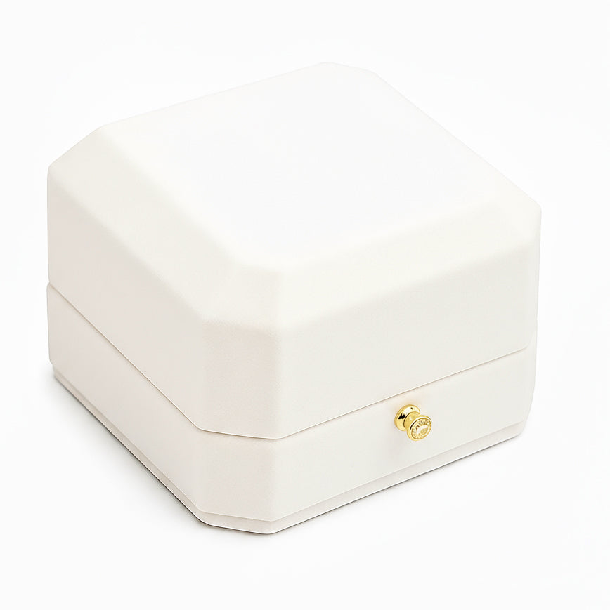 Display your engagement ring with minimalist luxury. This ivory and gold ring box features a soft grey suede interior that cushions and elevates your jewelry with understated elegance. The smooth matte finish and gold accent detail create a timeless presentation for life’s most meaningful moments.