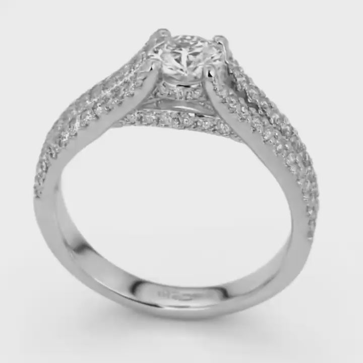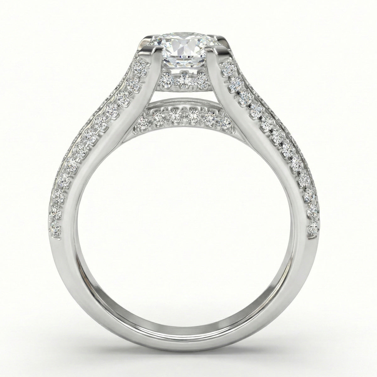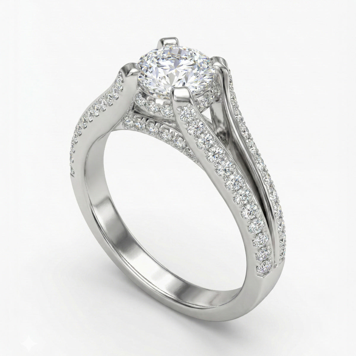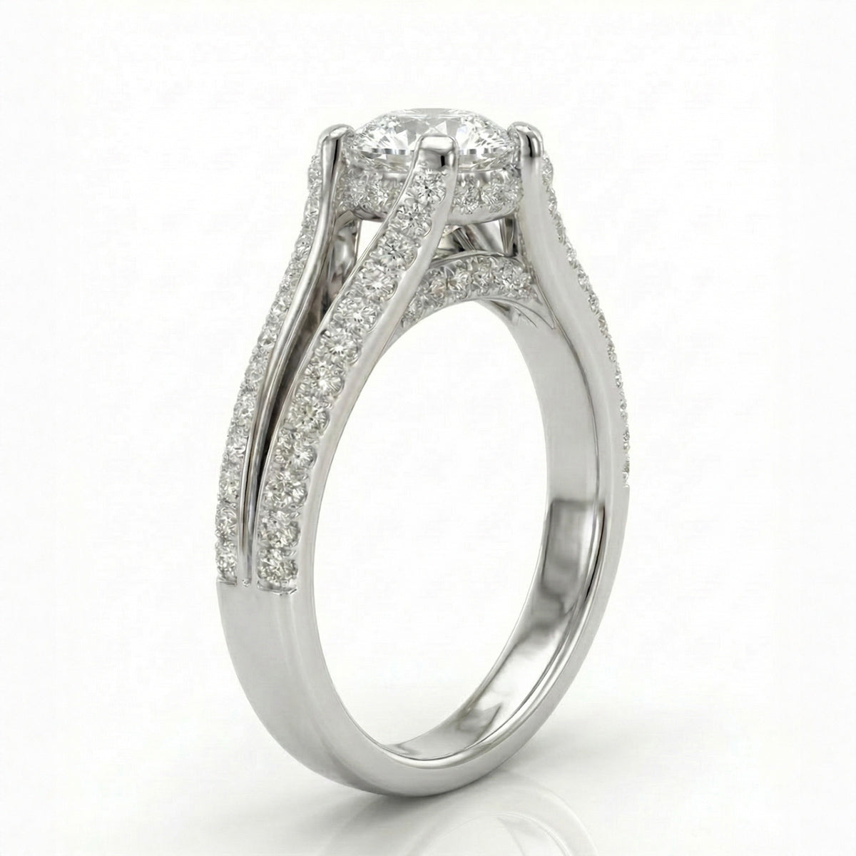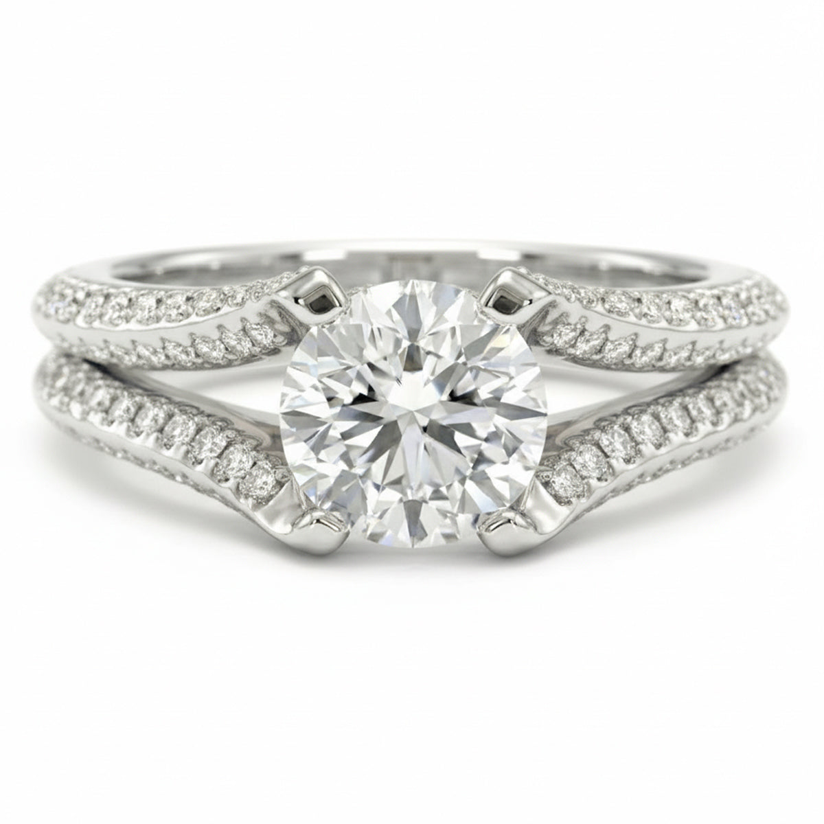 This sculptural ring showcases a refined split-shank silhouette that draws the eye inward with its fluid, graceful lines. The double pavé design adds brilliance along the band while maintaining an airy sense of balance, creating a look that feels both modern and timeless. Clean contours and a high-polish finish enhance its radiant presence from every angle.